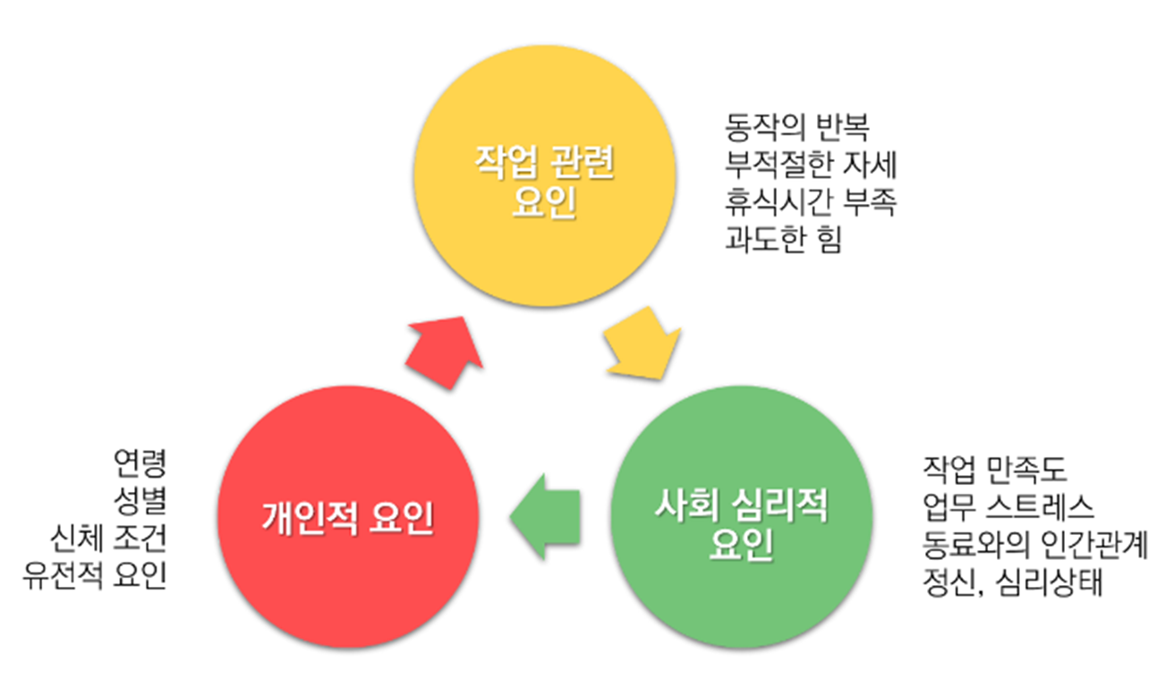 반복적인 동작, 부적절한 작업자세, 무리한 힘의 사용, 날카로운 면과의 신체접촉, 진동 및 온도 등의 요인에 의해 발생하는 건강장해로, 목, 어깨, 허리, 팔다리의 신경, 근육 및 그 주변 신체 조직 등에 나타나는 질환을 말합니다.